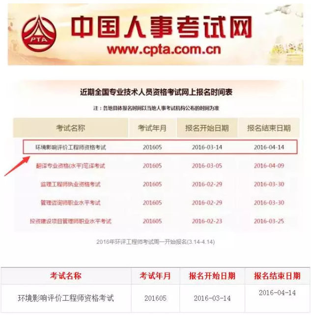 中國人事考試網(wǎng)3月12日公布“近期全國專業(yè)技術人員資格考試網(wǎng)上報名時間表”,其中“環(huán)境影響評價工程師資格考試”報名開始日期2016-03-14,報名結(jié)束日期2016-04-14。