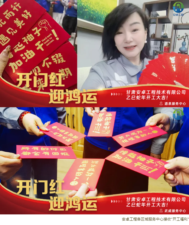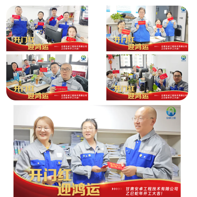 2月10日,正月十三,在這個洋溢著喜慶與祥和的美好日子里,甘肅安卓工程技術(shù)有限公司迎來了充滿生機與活力的開工大吉。全體員工精神抖擻,以踔厲奮發(fā)、篤行不怠的昂揚姿態(tài),滿懷激情地迎接這一開工儀式,共同翻開了蛇年的嶄新篇章。公司董事長龔復(fù)學(xué)、副董事長田苗、總經(jīng)理趙童潔、事業(yè)合伙人代表等高層領(lǐng)導(dǎo)親臨每一間辦公室,為員工送上“開門紅”紅包,寓意新的一年紅紅火火、福氣滿滿。